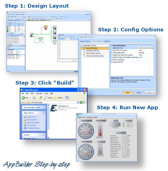 The AppBuilder Wizard allows you to create a customized, read-only application based on any CANCapture workspace/flowchart and database. This feature is useful for creating custom diagnostic tools, data-loggers, or just simplified CANCapture builds for non-CAN experts. The resulting EXE file will be completely stand-alone, having no prerequisites except that the ECOM driver be installed on the destination computer.